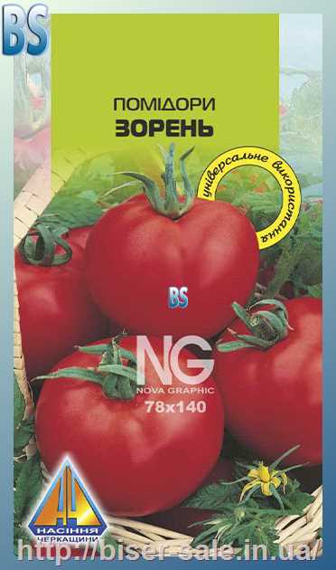 Помідори Зорень (0,3г), ранньостиглий, кущ висотою 1,5-1,7м, плоди масою 105-117г