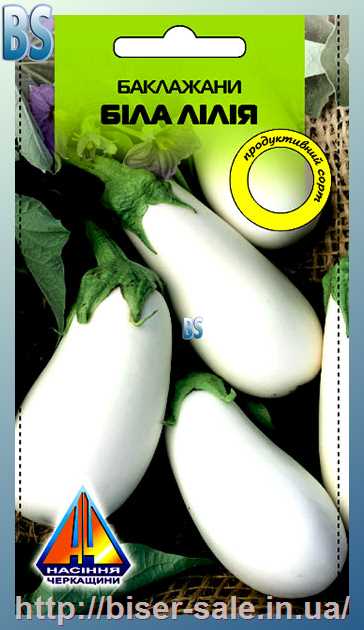 Баклажани Біла Лілія (0.2г), середньоранній, кущ висотою 0,55-0,6м, плоди масою 300-400г