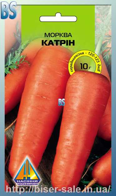 Морква Катрін (10г), середньопізня, коренеплід 11-14см, діаметром 2,1-3,4см, масою 145-215г